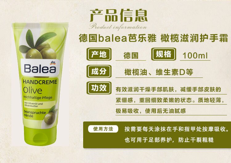 德国原装进口Balea芭乐雅橄榄油滋润双手柔润肌肤护手霜100ml