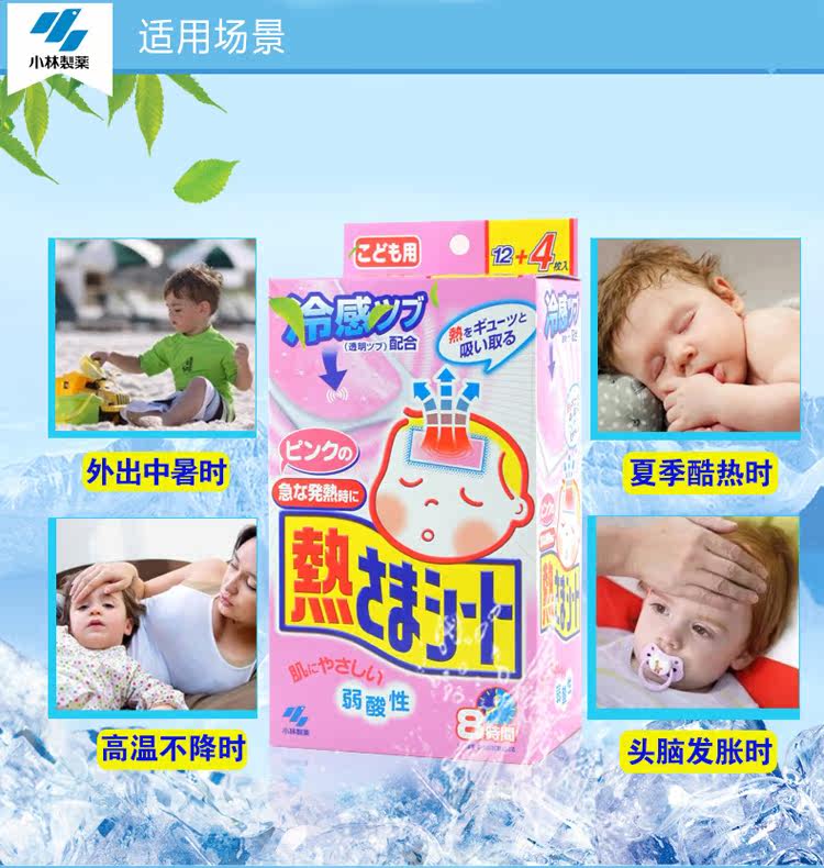 日本原装进口KOBAYASHI/小林制药冰宝贴散热退烧贴婴儿用(12片+4片)2岁以上/粉色
