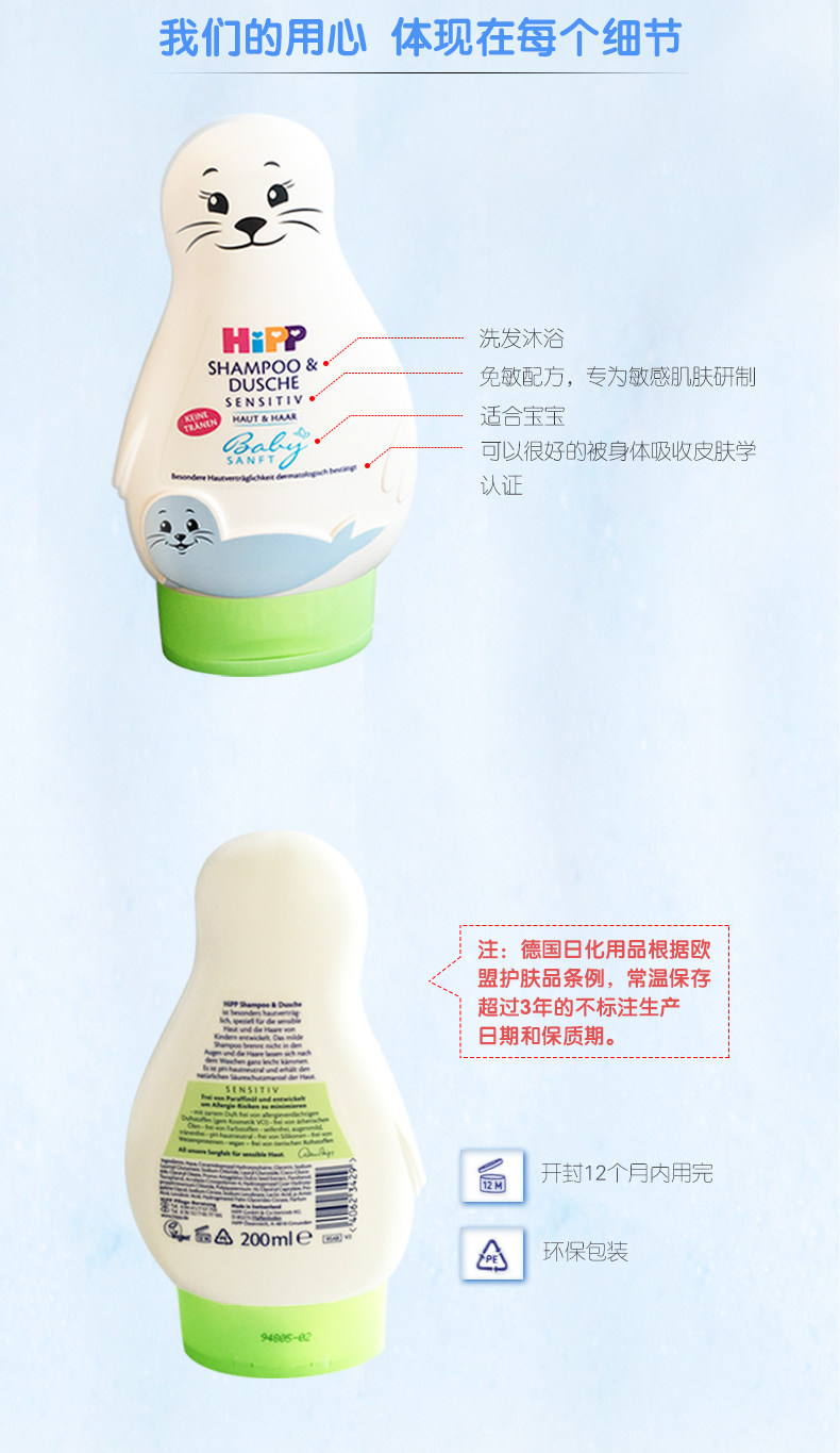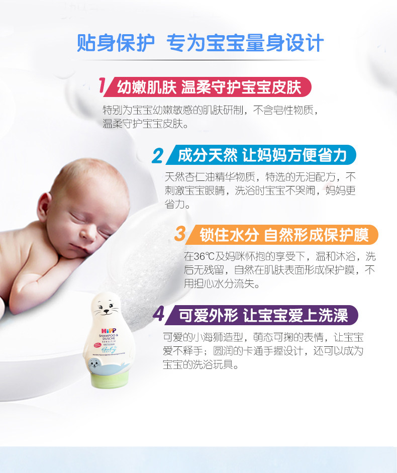 德国进口Hipp喜宝儿童免敏无泪婴儿小海狮宝宝洗发水沐浴露二合一200ml