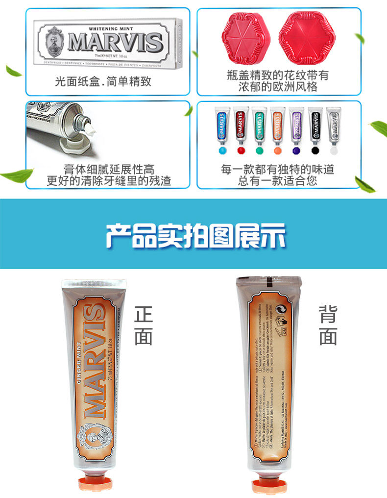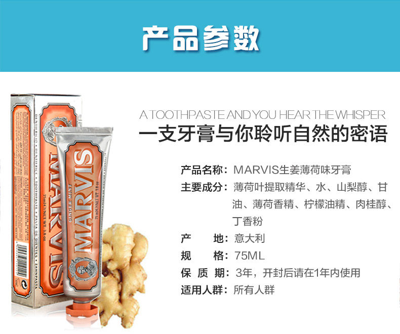 意大利进口MARVIS马尔维斯牙膏生姜薄荷味75ml 清热镇痛 预防龋齿(不计入包邮金额)