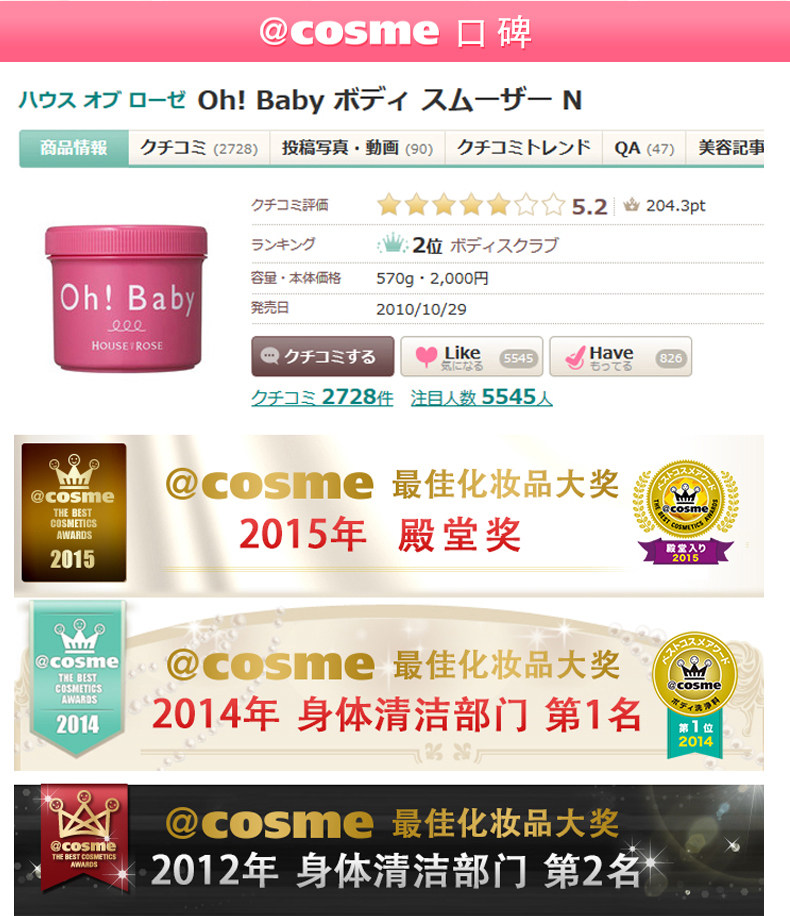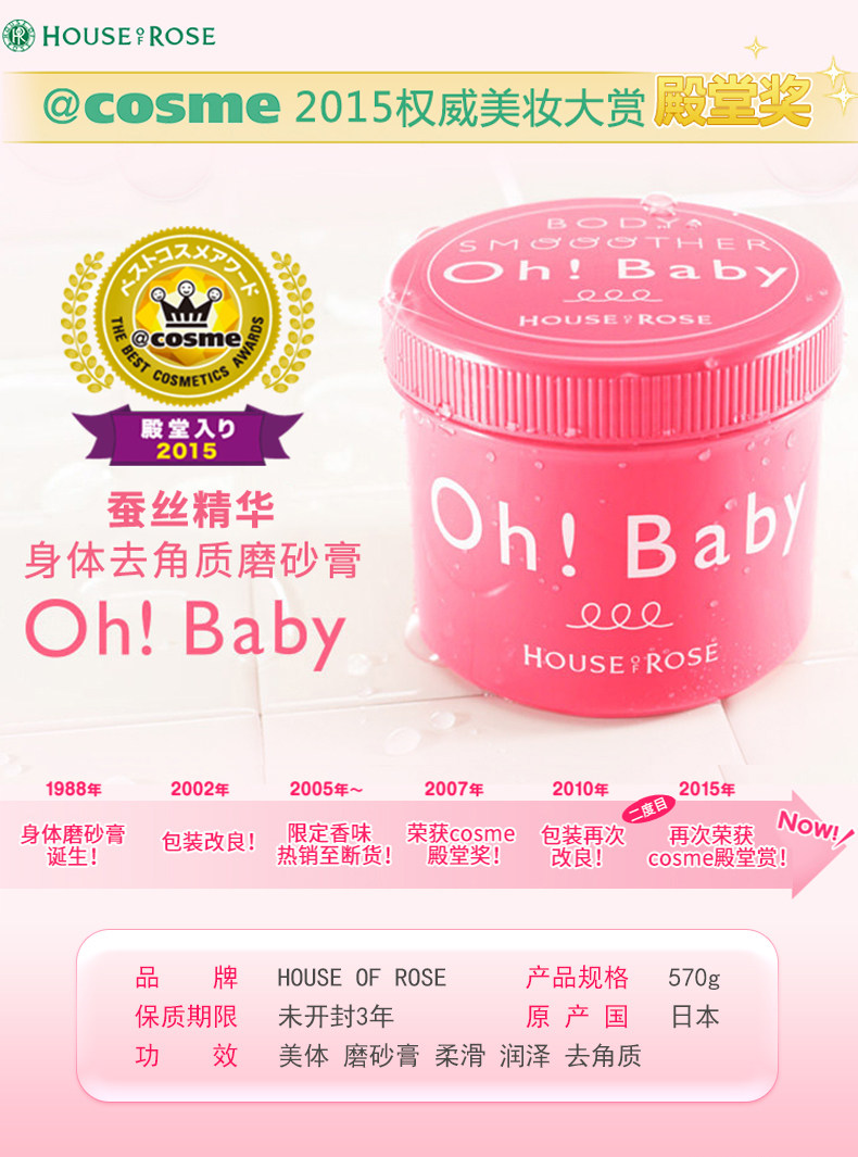 日本原装进口oh baby@cosme殿堂级身体去角质磨砂膏570g粉色 帮你还原baby肌一样的光滑细腻