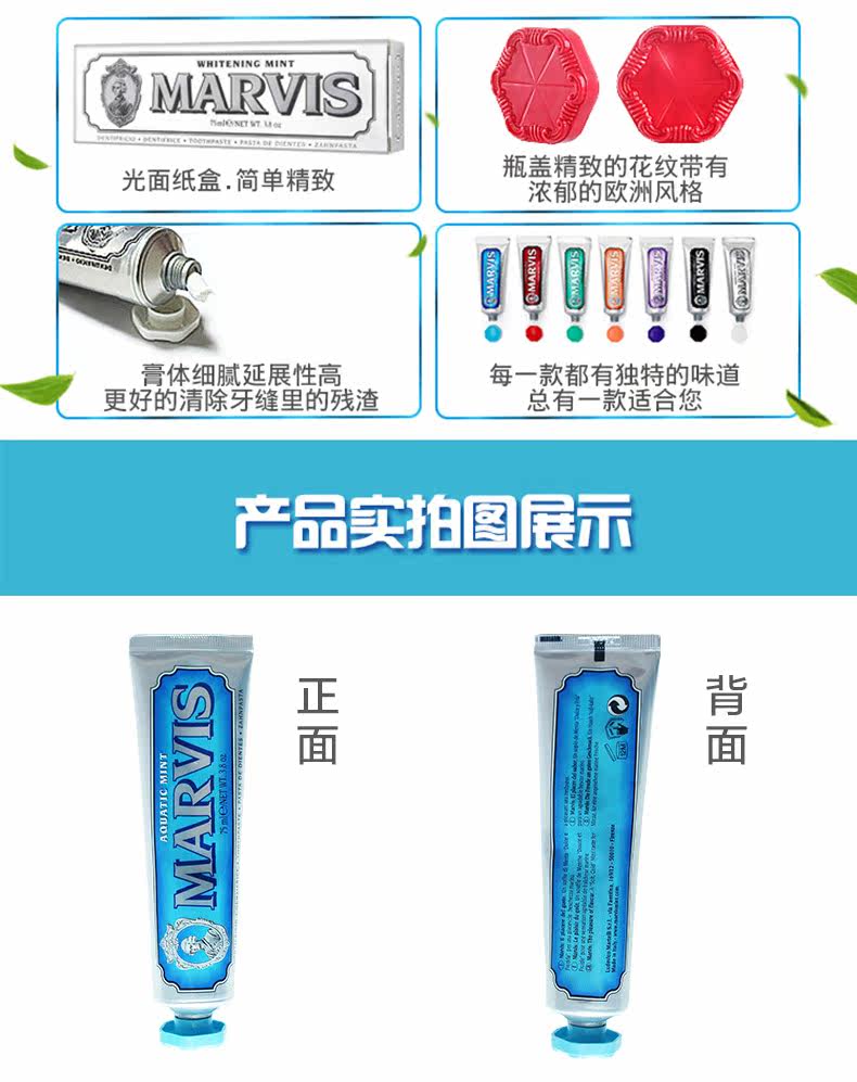 意大利进口最新版MARVIS马尔维斯牙膏清新薄荷味85ml 去火防燥 减少舌苔 健康牙龈 薄荷香型 气味清新(不计入包邮金额)