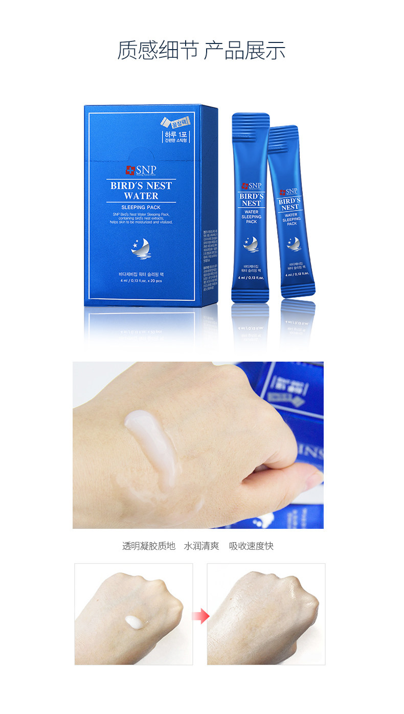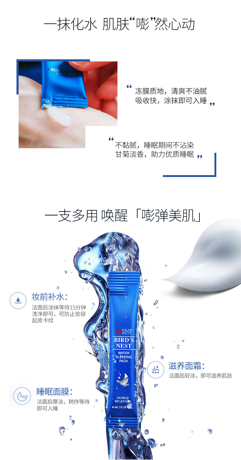 韩国原装进口SNP燕窝睡眠面膜20支 补水保湿紧致提亮肤色收缩毛孔免洗男女 补水保湿 夜间修护 免洗睡眠面膜